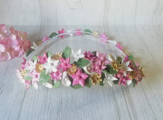 Corona Floral para Novia en Rosa, Verde, Blanco y Dorado
