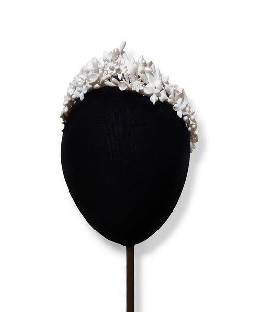White Bridal Tiara with Flowers, Leaves, and Porcelain Pistils