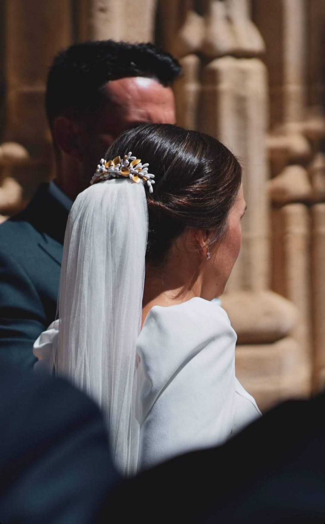 Entirely handmade with cold porcelain*, it features delicate buds and leaves in two customizable colours to perfectly match your wedding look.